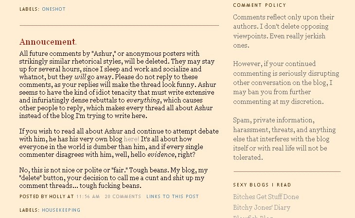"Holly wrote...Ashur, this is my fucking blog where people can have fucking conversations without your fucking permission and you need to go suck your own cock somewhere else now.